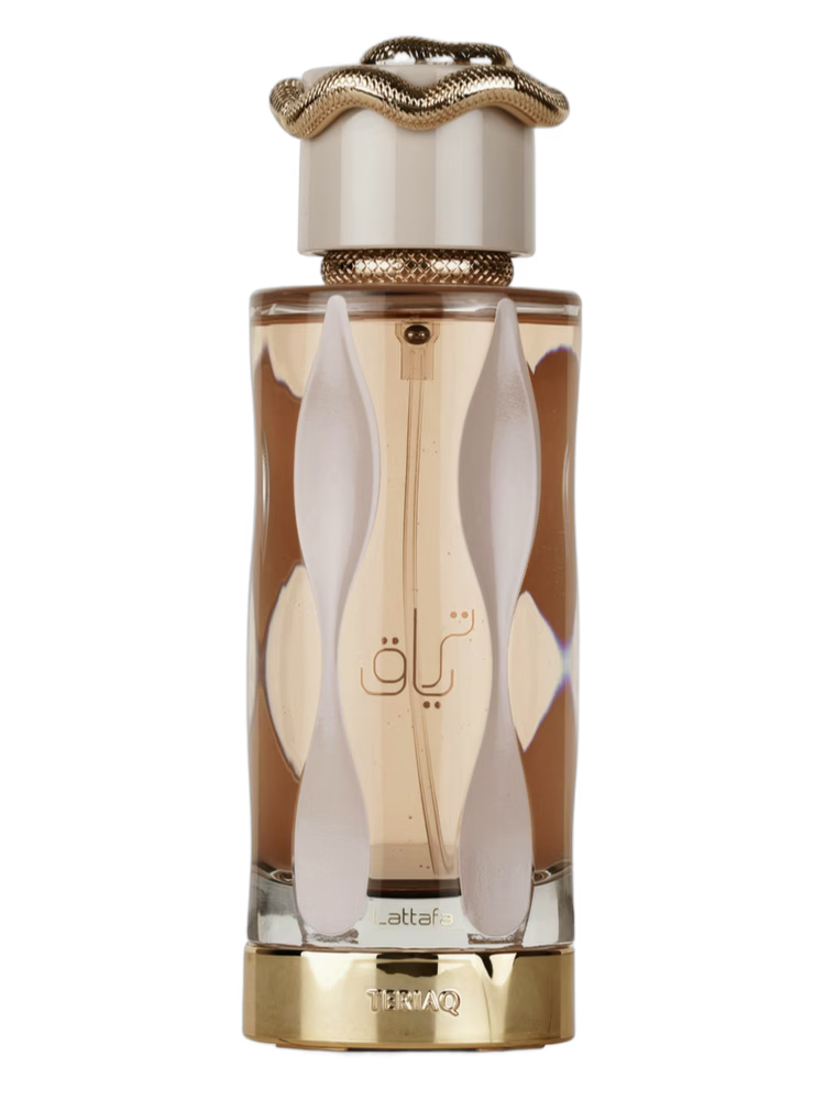 Teriaq Lattafa Perfumes عطر للجنسين. Teriaq صدر عام 2024. Quentin Bisch قام بتوقيع هذا العطر. إفتتاحية العطر الكاراميل, اللوز المر, المشمش و الفلفل الوردي; قلب العطر العسل, الراوند, الزهور البيضاء و الورد; قاعدة العطر تتكون من الجلود, الفانيليا, المسك, اللابدانوم و نجيل الهند.